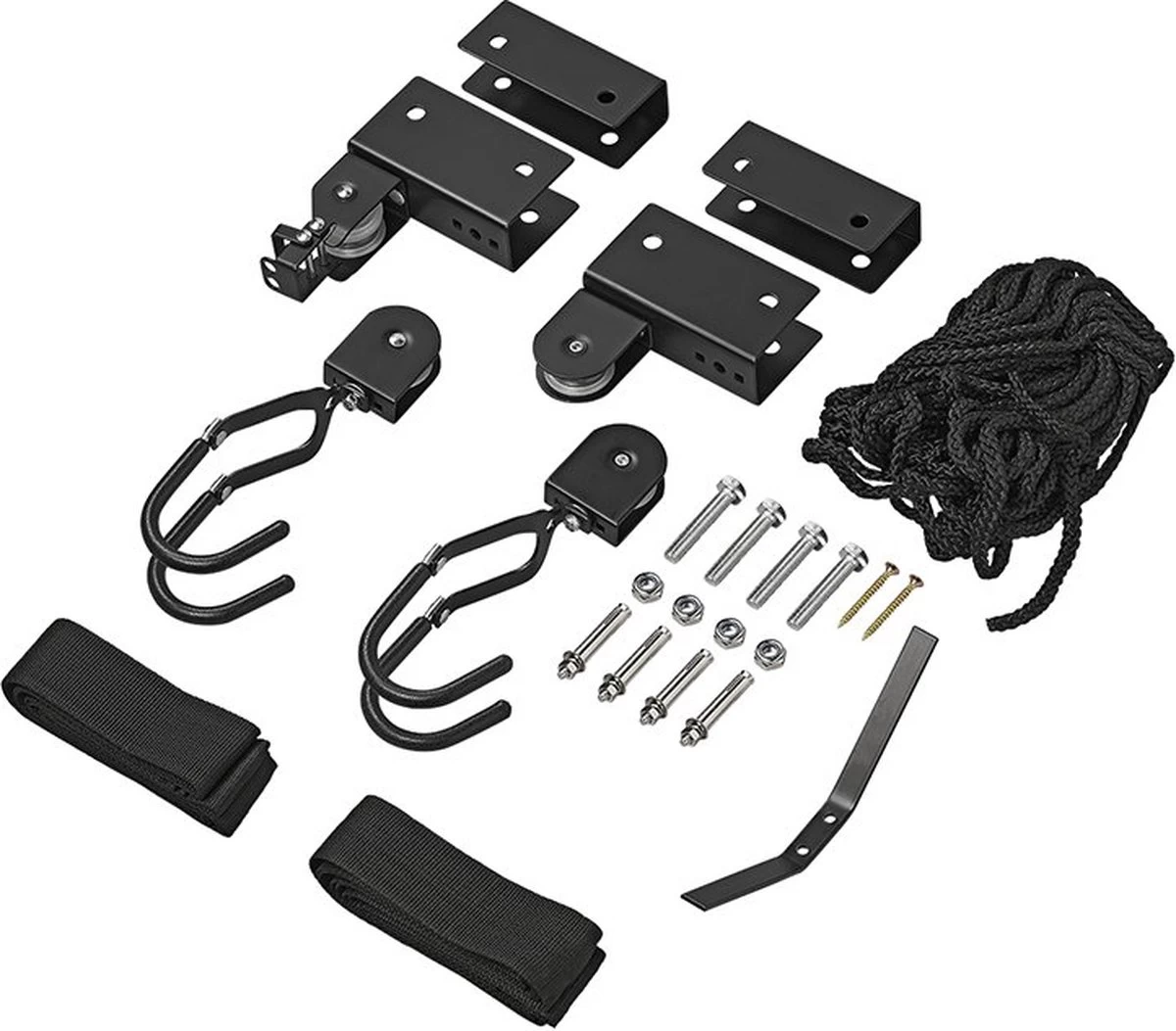 Gebruik deze fietslift om eenvoudig ruimte te creëren in je schuur, storage box, of andere opslagruimtes. De fietslift is makkelijk te monteren aan het plafond en is geschikt voor de meeste soorten fiesten, kayak’s, ladders of andere spullen die je aan het plafond wil opbergen. Door de meerdere bevestigingspunten zit het ophangsysteem stevig vast en kan de takel meer dan 50 kg hebben.