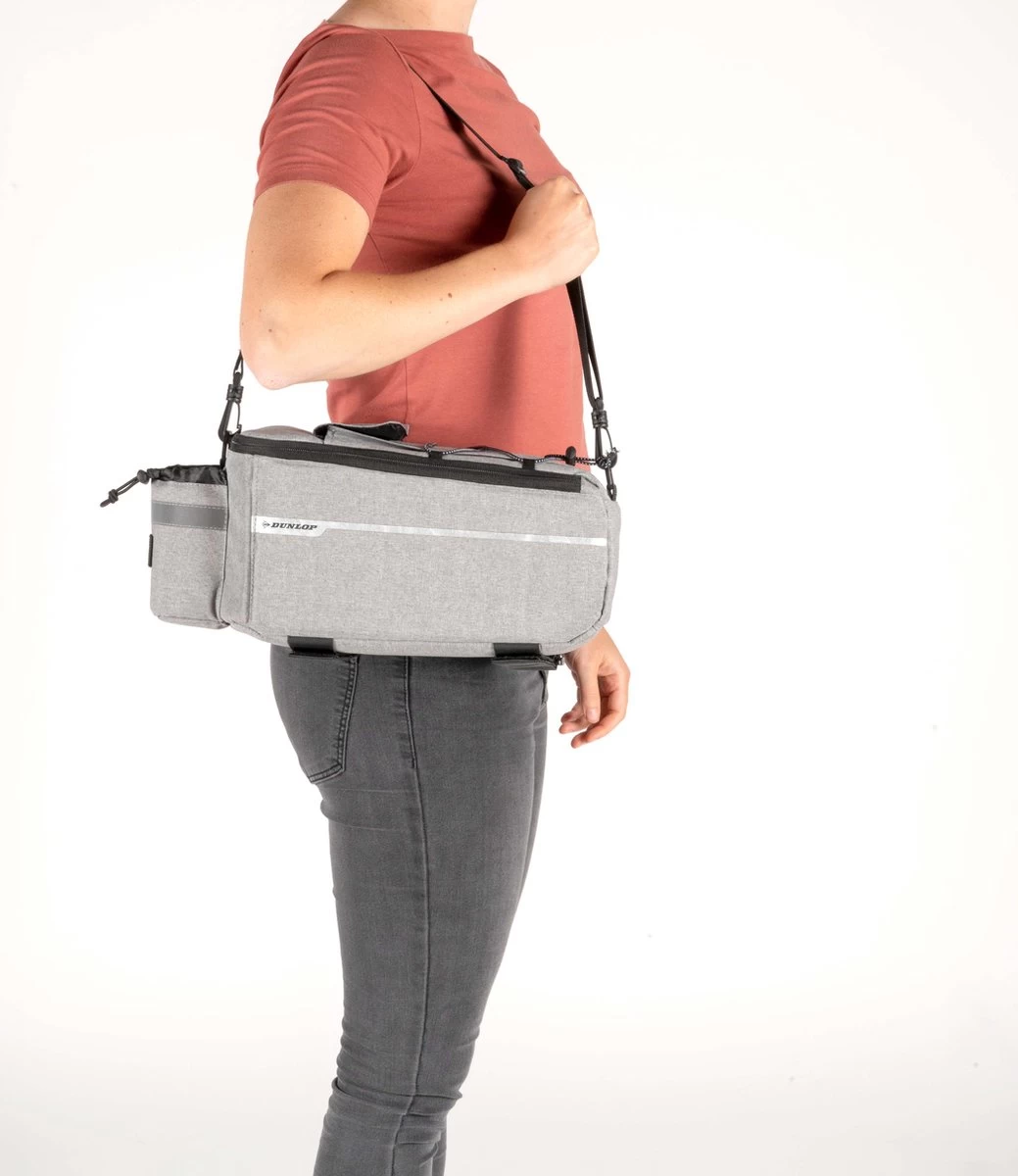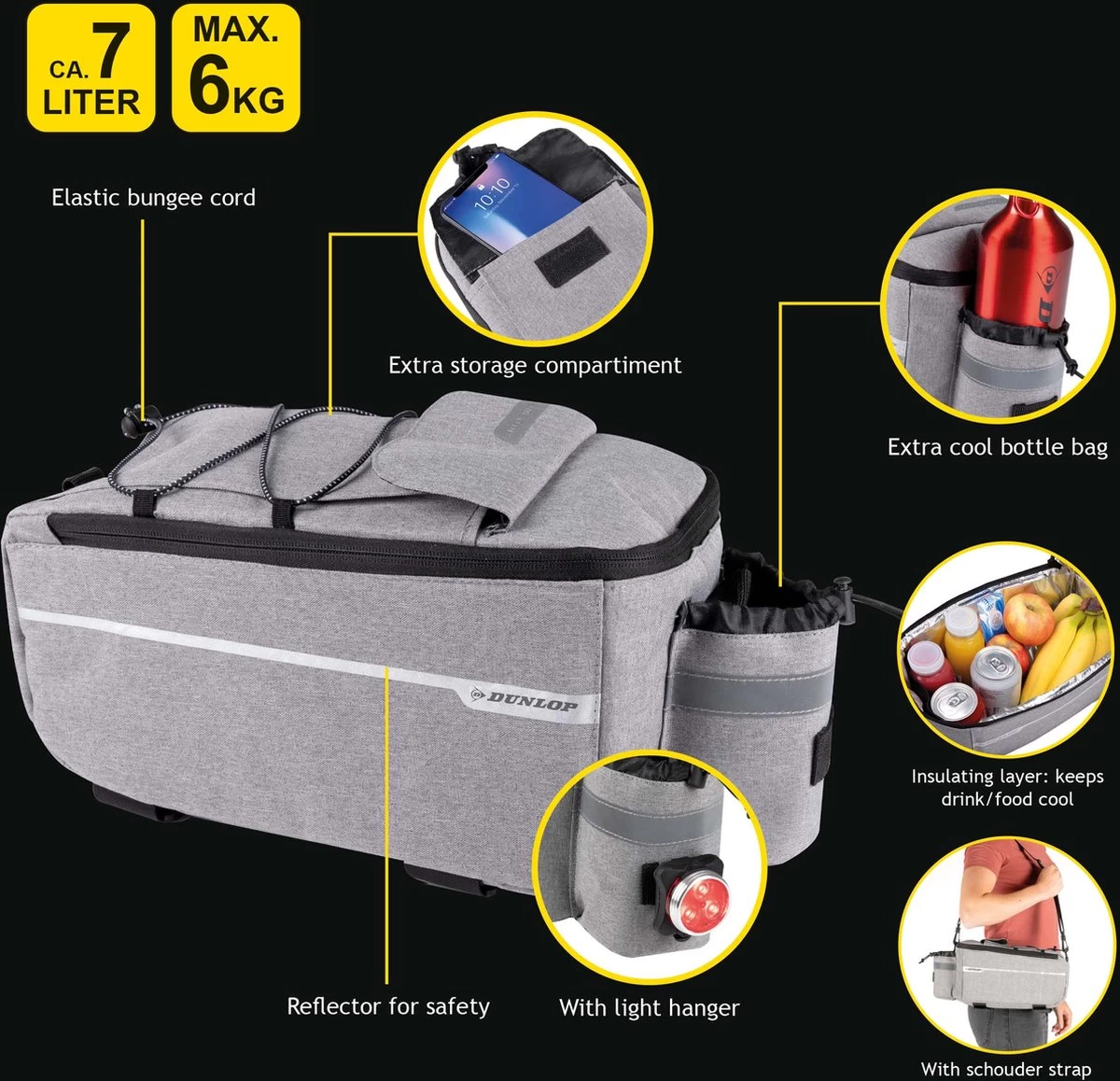 De Dunlop koeltas voor de bagagedrager van je fiets is een droom voor elke fietsliefhebber. Wanneer je een heerlijk stukje wilt gaan fietsen is het natuurlijk fijn om een hapje en een verkoelend drankje mee te kunnen nemen. De fietstas van Dunlop beschikt over een isolerende binnenlaag die eten en drinken warm of koud houd van minimaal -10 tot maximaal 70 graden. Daarnaast vindt je aan de achterzijde van de bagagedragertas een koelvak voor een drinkfles en aan de bovenzijde een extra opbergvak voor bijvoorbeeld je telefoon. De fietstas heeft een maximale inhoud van 7 liter en een maximale draagcapaciteit tot 6 kilogram. Zo kun je gemakkelijk een lekkere lunch of je favoriete drankjes meenemen op die lange fietstocht. Met de bijgeleverde schouderband kun je de koeltas ook makkelijk te voet meenemen wanneer je van de fiets afstapt.