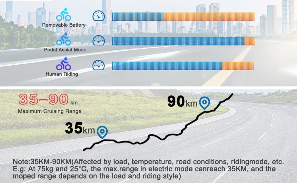 Endurance performance: 35KM-90KM (affected by load, temperature, road condition, driving mode, etc. Example: At 75kg and 25°C, the maximum range in electric mode can reach 35KM, and the range of the moped depends on the load and driving style )