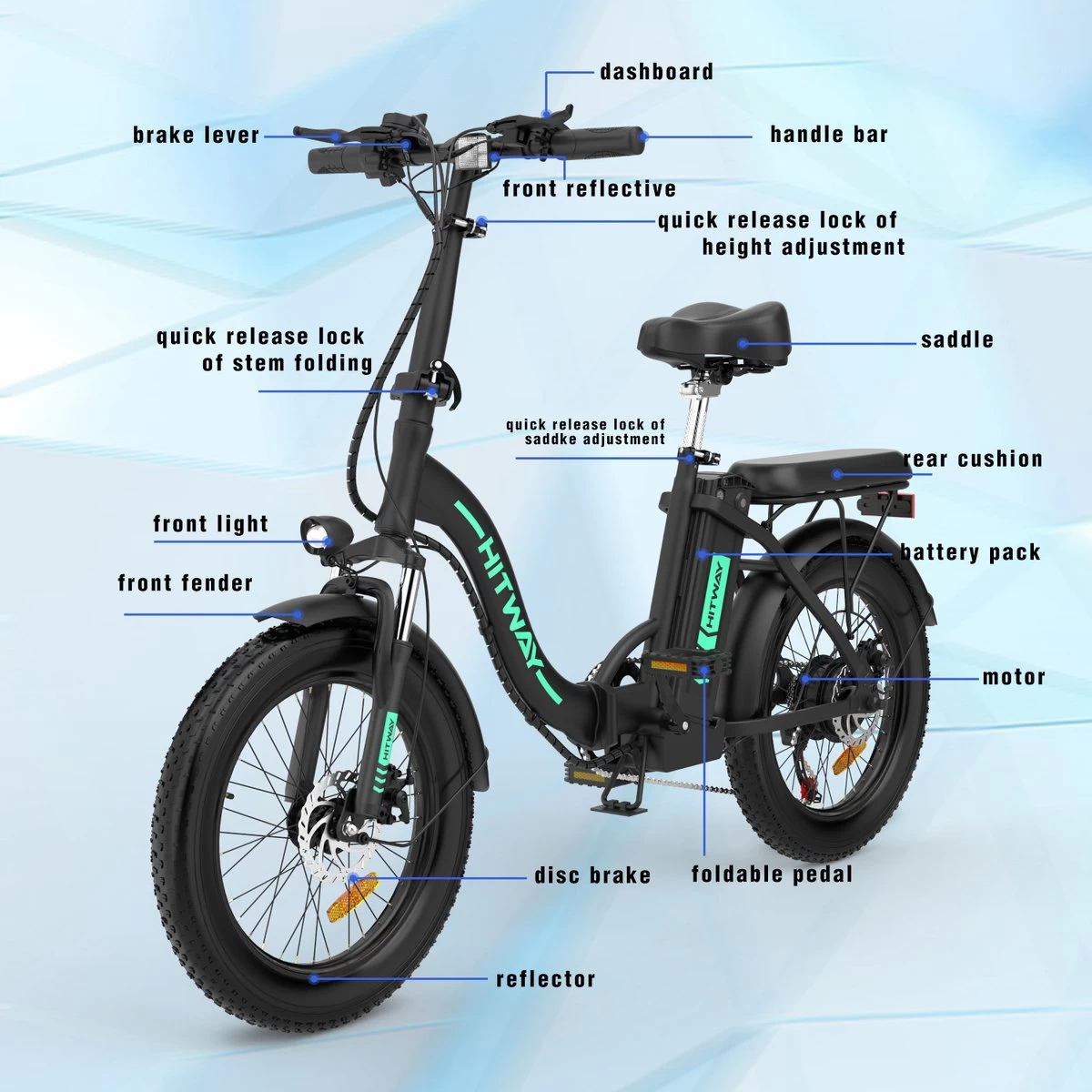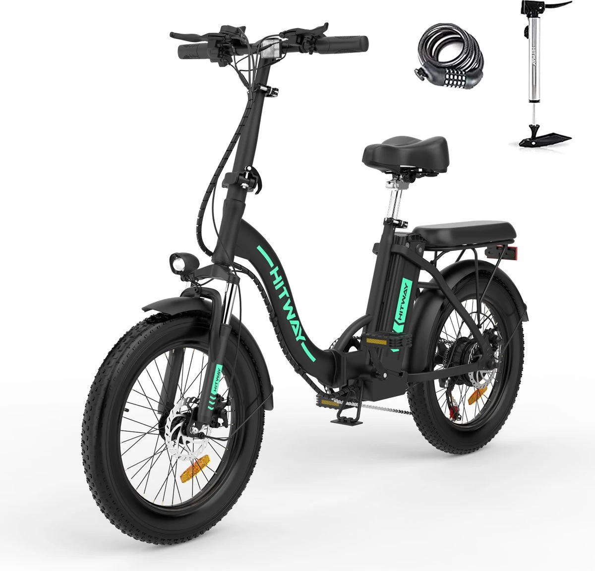 Professionele 20 inch e-fatbike: de Hitway elektrische fiets is speciaal uitgerust met supersterke professionele 3.0 fatbanden, die slijtvast en lekbestendig zijn. U kunt vrij rijden in de bergen en in de stad en de natuur verkennen. U kunt ervan genieten in sneeuw, zand en andere plaatsen.