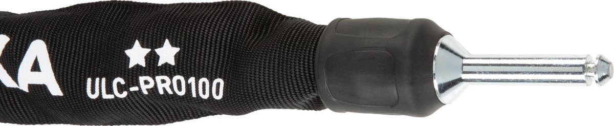 De diameter van de schakels is 8 mm, de gehard stalen plug-in pin is 10 mm dik en hij heeft een ART 2 sterren goedkeur. Hij heeft een lengte van 100 cm en heeft een zwarte polyester hoes om de fiets te beschermen tegen krassen.