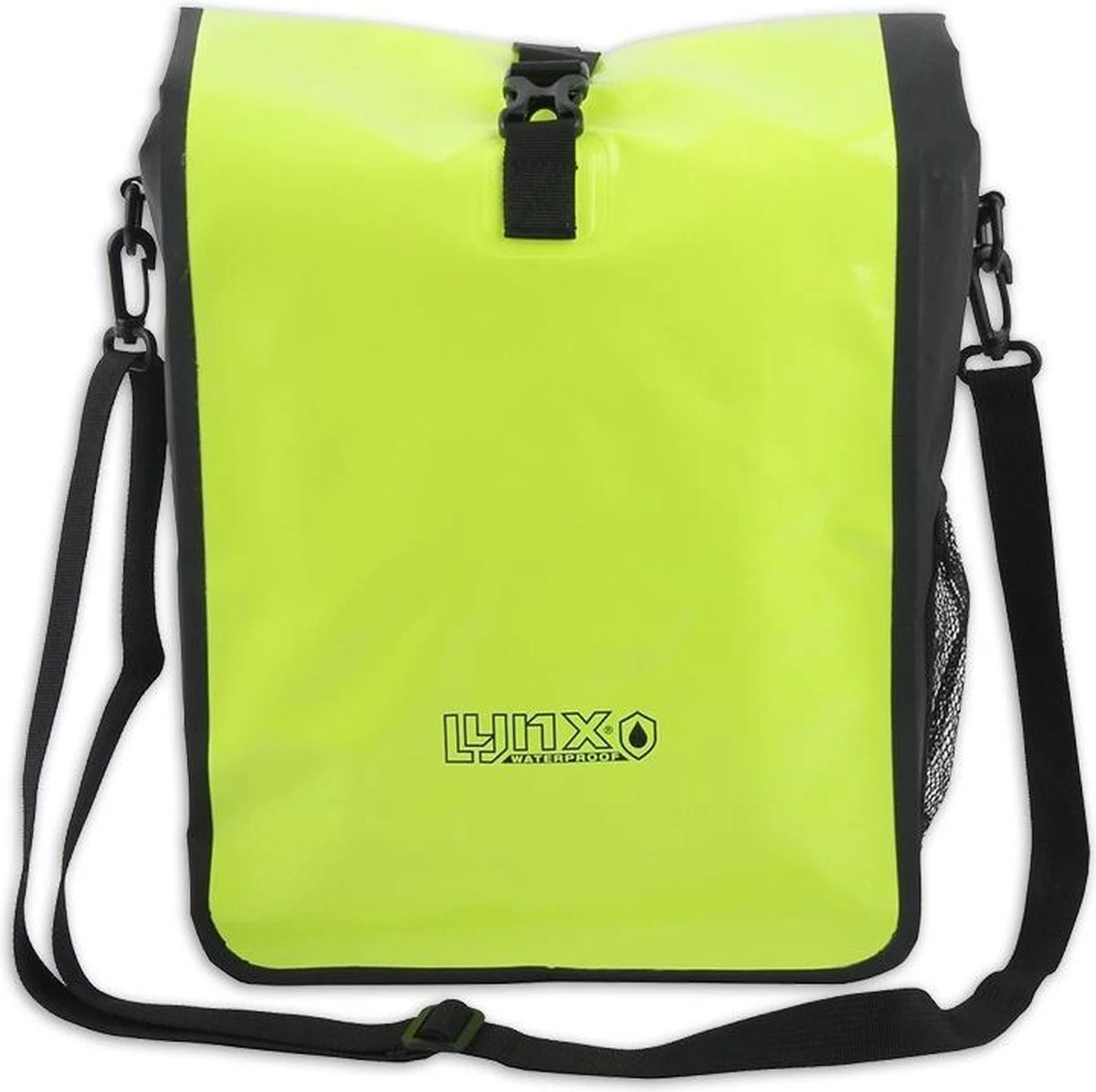 Deze enkele Valley XL fietstas van Lynx, in de kleuren zwart met neon geel, is 100% waterdicht.