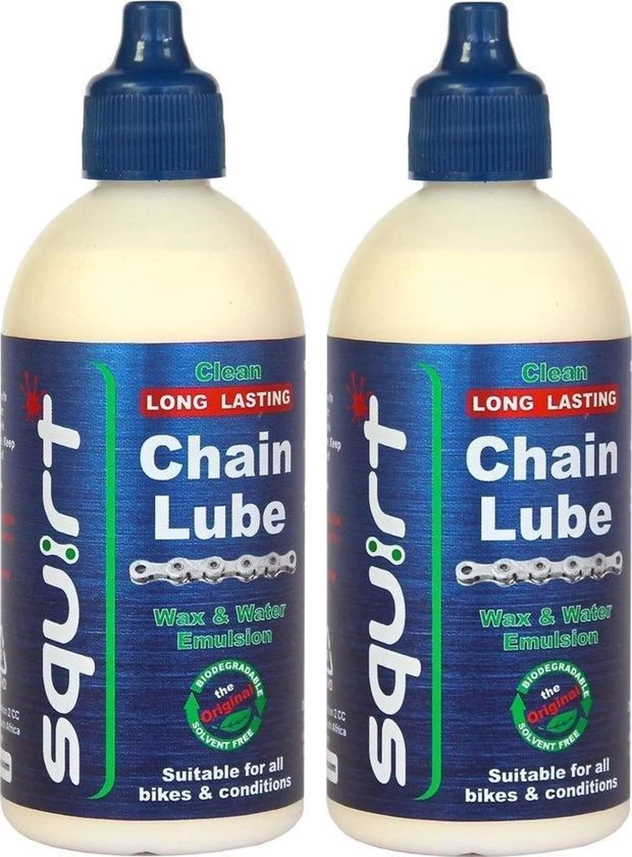 Squirt lube is een biologisch afbreekbaar smeermiddel dat uit een emulsie van wax en water bestaat. Het bevat geen oplosmiddel. Na het aanbrengen dringt de vloeistof door tot in het binnenste van de ketting. Het water verdampt langzaam en de wax laat een laagje achter dat water,- zand- en vuilafstotend is (olie trekt juist vuil aan!).